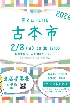 第2回 TETTO古本市 ギャラリー 開催日:2026年2月8日(日) 開催時間:10:30 〜 15:00 お問い合わせ 釜石市民ホールTETTO 【TEL】0193-22-2266 【メール】daihyo@tetto-kamaishi.jp