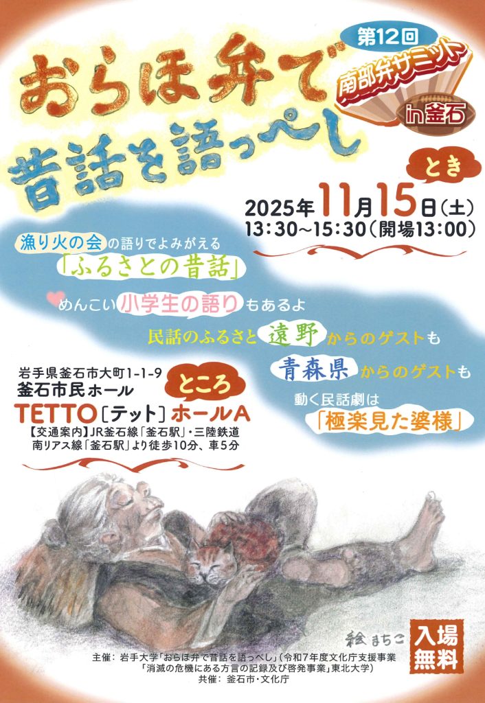 【主催】岩手大学「おらほ弁で昔話を語っぺし」(令和7年度文化庁支援事業「消滅の危機にある方言の記録及び啓発事業」東北大学) 【共催】釜石市・文化庁 |