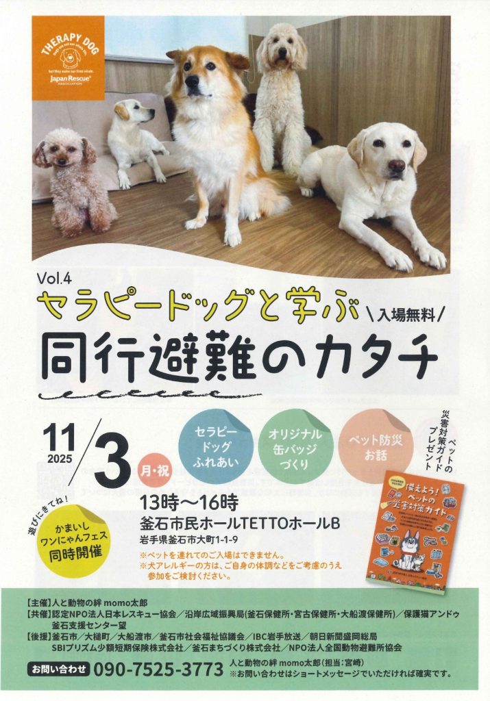 セラピードッグと学ぶ、同行避難のカタチ セミナー・講座 イベント概要 開催日 2025年11月3日(月) 開場時間 12:45 開催時間 13:00 〜 16:00 会場 釜石市民ホールTETTO ホールB 料金 無料 お問い合わせ 人と動物の絆momo太郎 090-7525-3773(宮崎) share