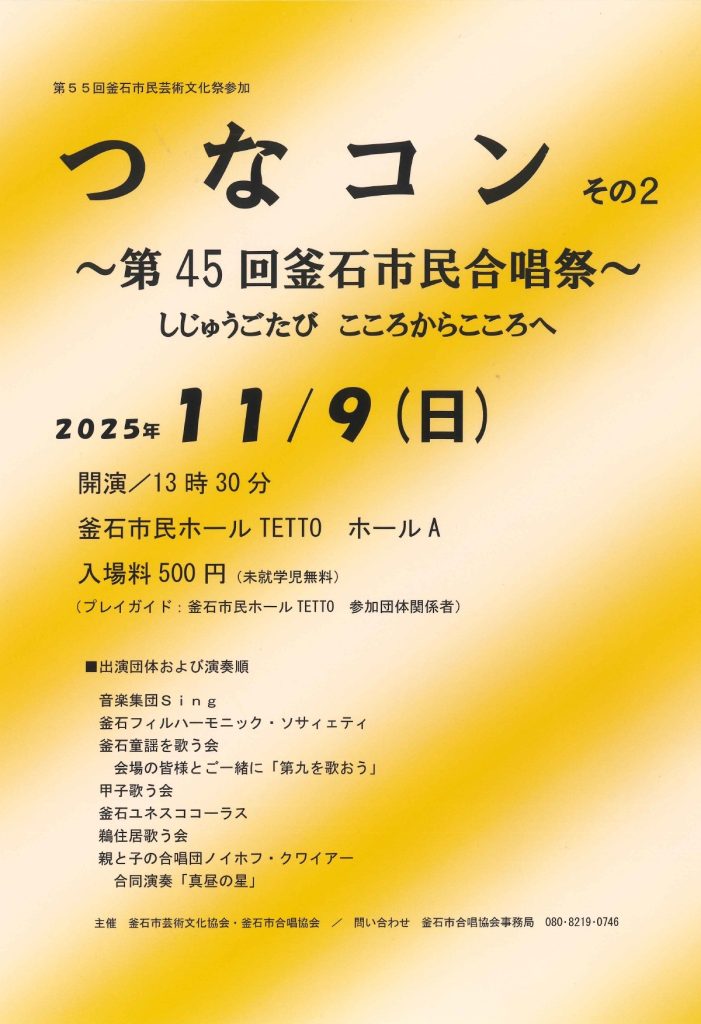 つなコン その2 第45回釜石市民合唱祭 チケット販売中コンサート イベント概要 第55回釜石市民芸術文化祭 参加 つなコン しじゅうごたび こころからこころへ ~つながろう・つなげよう・絆のコンサート~ 開催日 2025年11月9日(日) 開場時間 13:00 開演時間 13:30 会場 釜石市民ホールTETTO ホールA 料金 500円 お問い合わせ 釜石市合唱協会 080-8219-0746 主催等 【主催】釜石市合唱協会 share