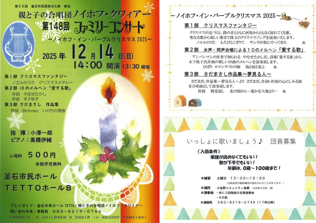 第148回ファミリーコンサート ~ノイホフ・イン・パープルクリスマス~ チケット販売中コンサート発表会 イベント概要 開催日 2025年12月14日(日) 開場時間 13:30 開演時間 14:00 終演時間 16:00 会場 釜石市民ホールTETTO ホールB 料金 500円(未就学児無料) お問い合わせ 親と子の合唱団ノイホフクワイアー 080-8219-0746 share