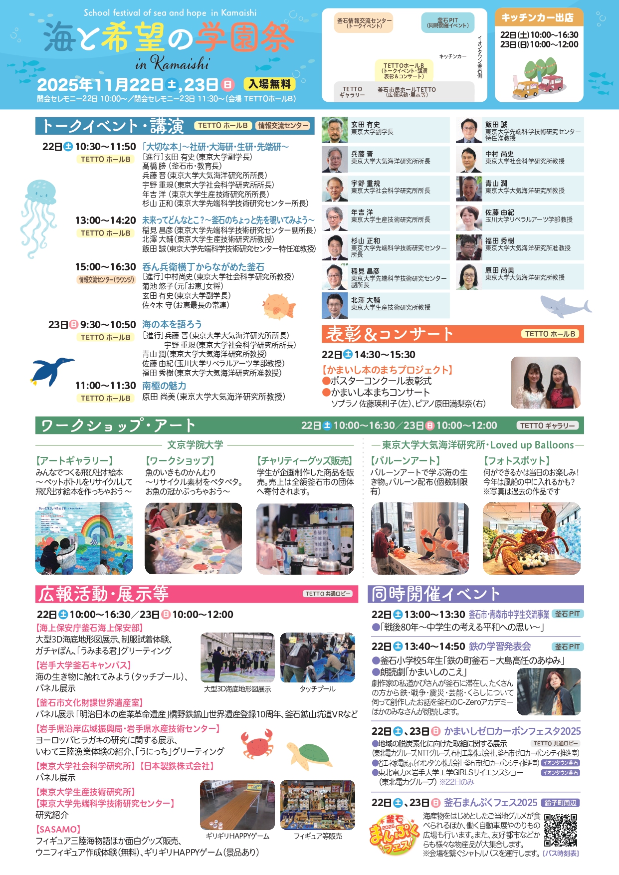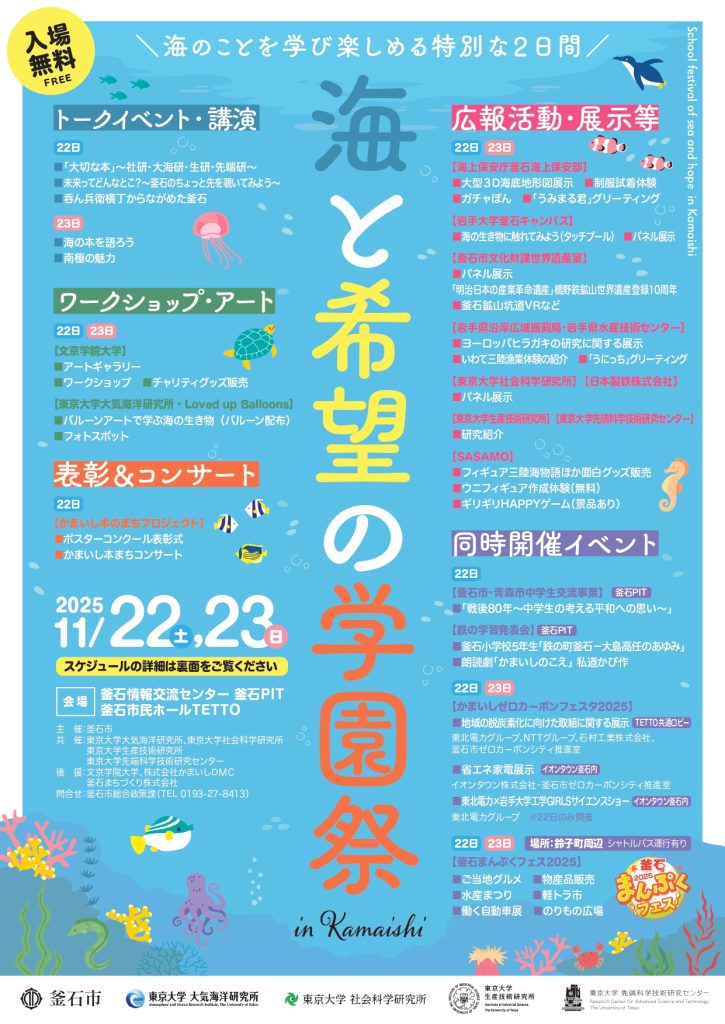 海と希望の学園祭 シンポジウム・学会セミナー・講座その他 イベント概要 開催日 2025年11月22日(土)〜 11月23日(日) 会場 釜石市民ホールTETTO ホールB, ギャラリー, 共通ロビー お問い合わせ 釜石市総合政策課 企画調整係0193-27-8413 share