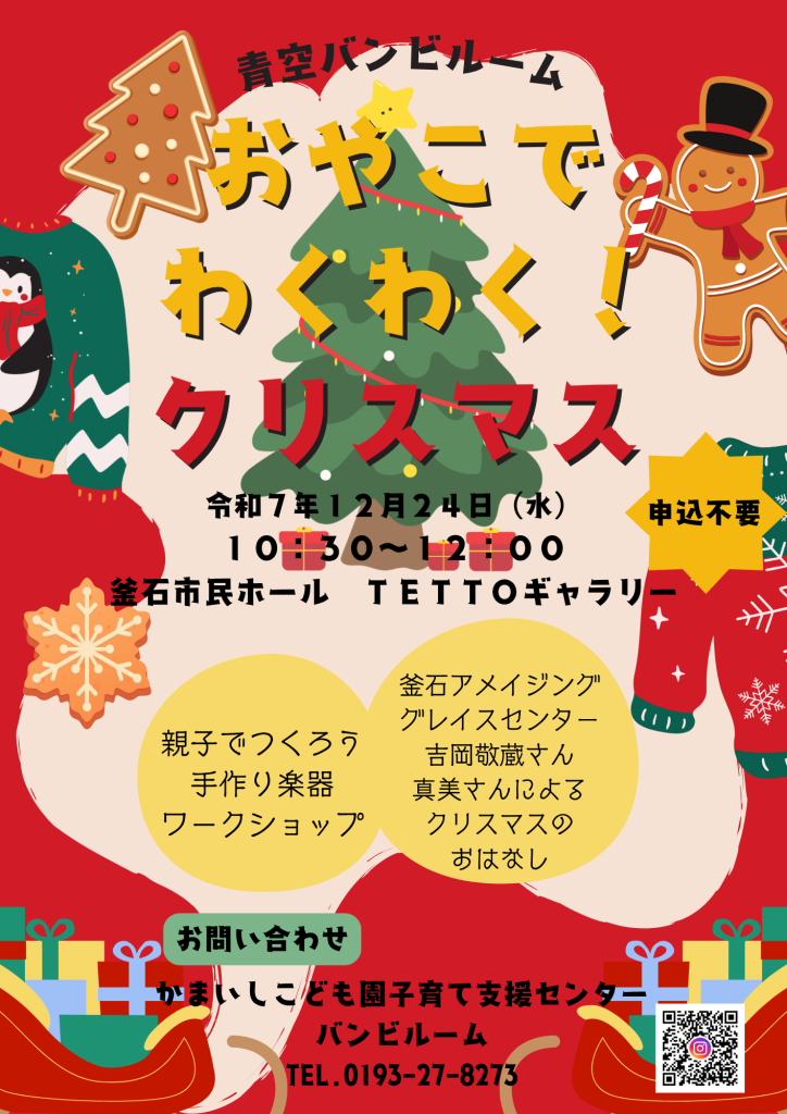 青空バンビルーム『おやこでわくわくクリスマス!』 キッズ イベント概要 開催日 2025年12月24日(水) 開催時間 10:30 〜 12:00 会場 釜石市民ホールTETTO ギャラリー 料金 無料 お問い合わせ かまいしこども園 子育て支援センターバンビルーム 0193-27-8273 share