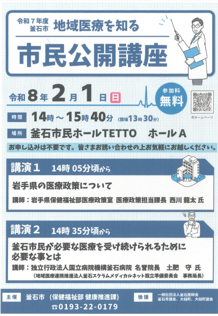 地域医療を知る市民公開講座 セミナー・講座 イベント概要 開催日 2026年2月1日(日) 開場時間 13:30 開催時間 14:00 〜 15:40 会場 釜石市民ホールTETTO ホールA 料金 無料 お問い合わせ 釜石市健康推進課 0193-22-0179 share