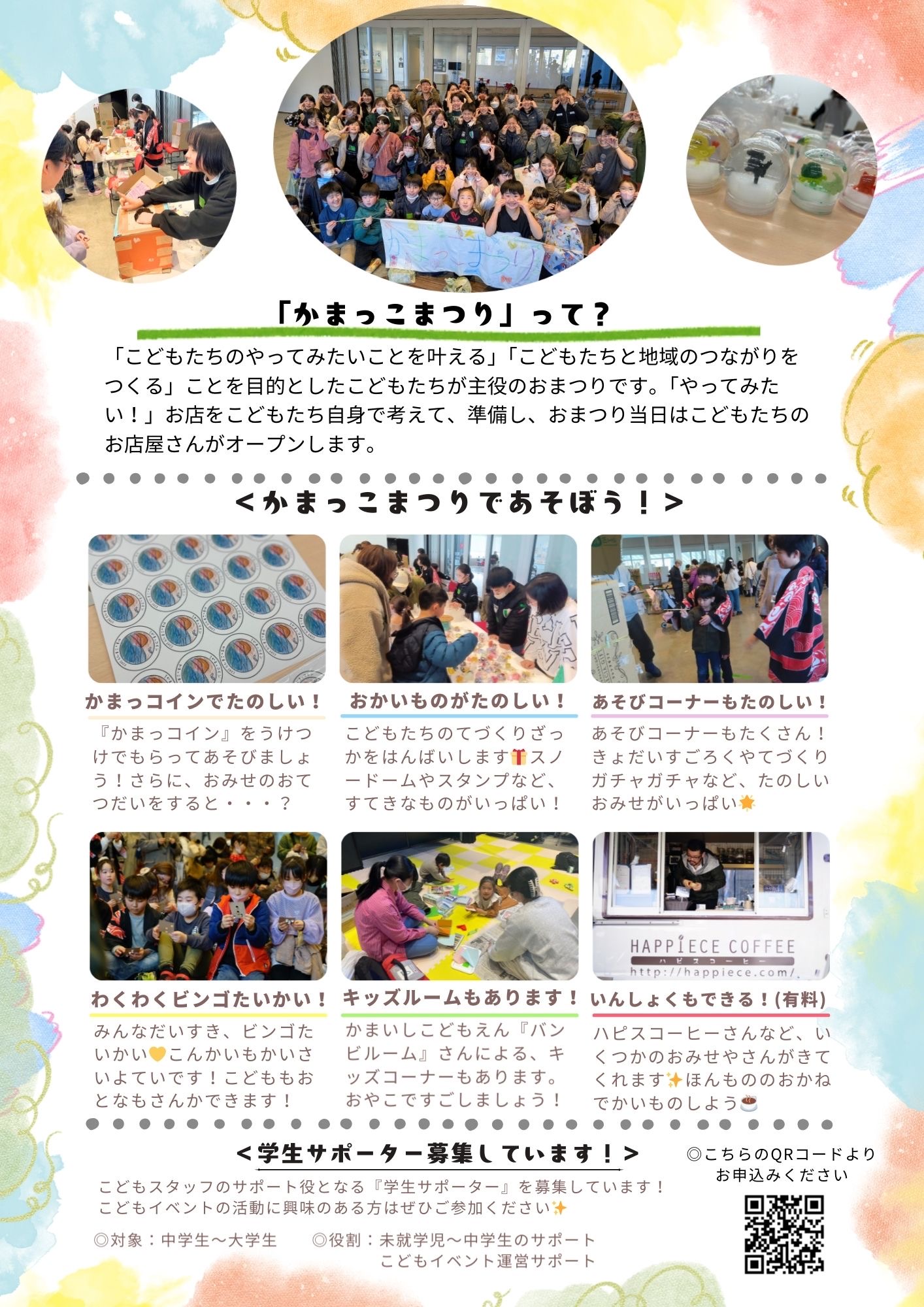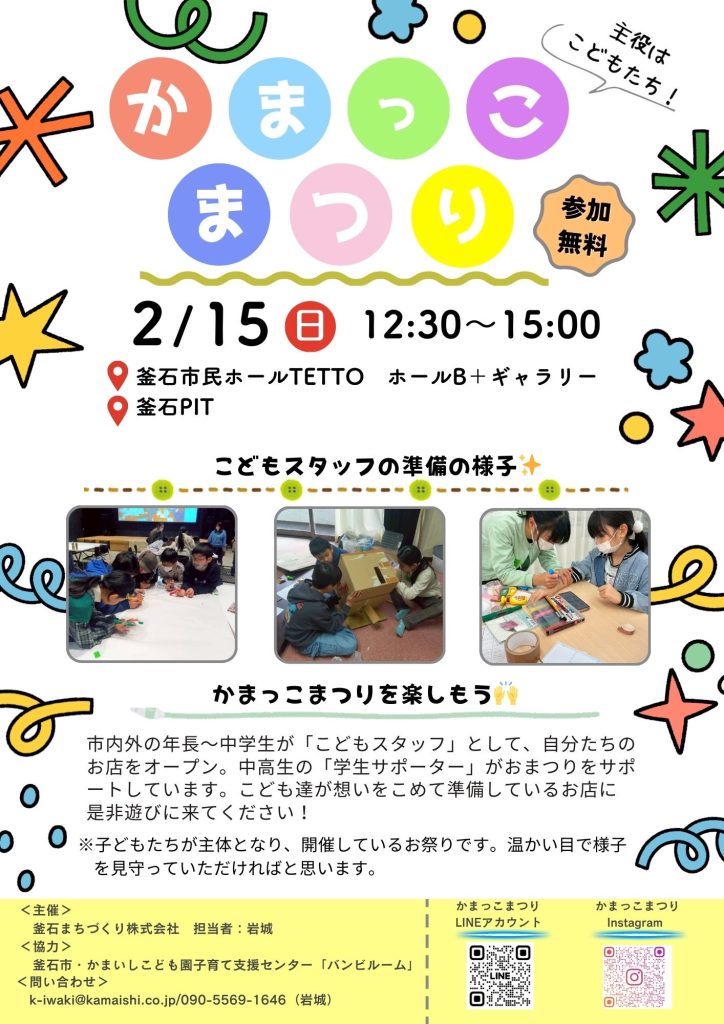 主役はこどもたち!かまっこまつり キッズ イベント概要 開催日 2026年2月15日(日) 開催時間 12:30 〜 15:00 会場 釜石市民ホールTETTO ホールB, ギャラリー 釜石情報交流センター 釜石PIT 料金 無料 お問い合わせ 釜石まちづくり(株) 担当岩城 【メール】k-iwaki@kamaishi.co.jp 主催等 【主催】釜石まちづくり株式会社 share