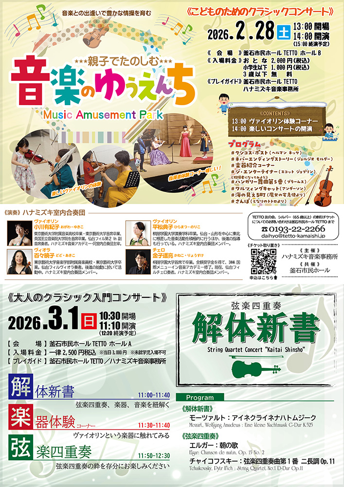 窓口販売 電話予約 お取り置き申込フォーム【2026年2月27日(金) 17:00まで】 ハナミズキ室内合奏団 釜石コンサートチケット申込フォーム https://forms.gle/AKSFEXmsNFNrKrNCA