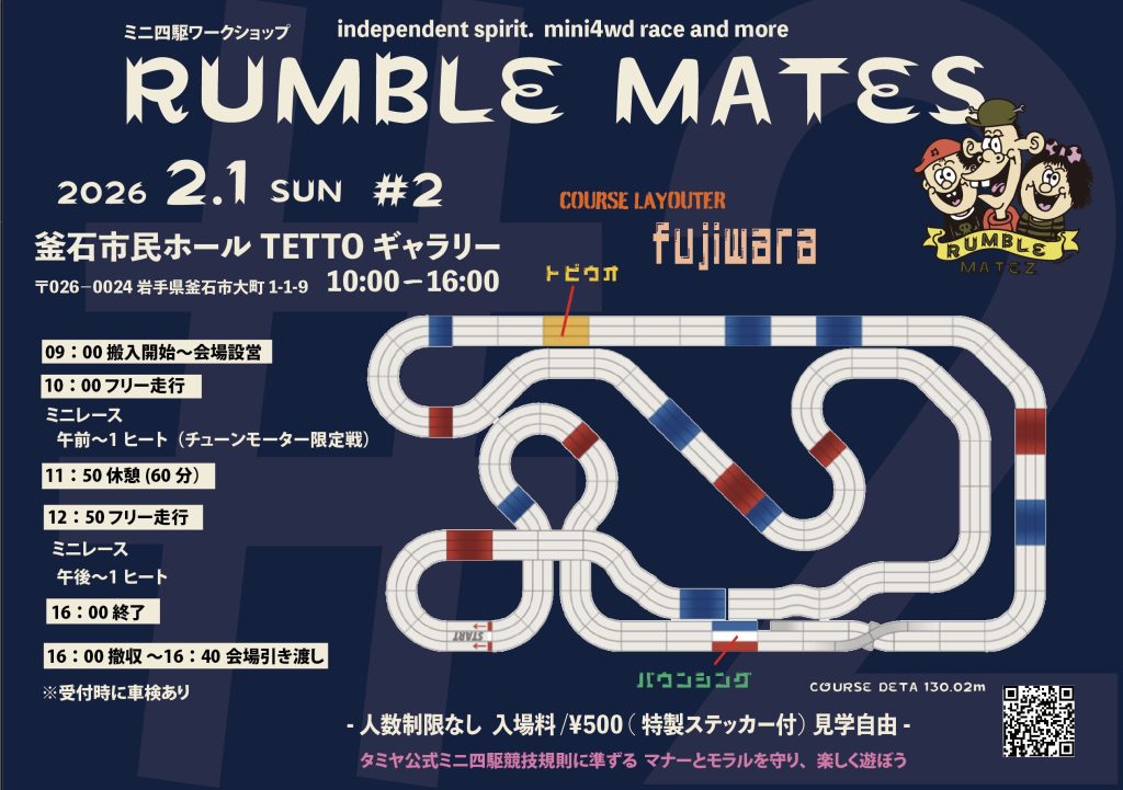 ミニ四駆ワークショップ RUMBLE MATEZ ランブルメイツ その他 イベント概要 開催日 2026年2月1日(日) 開催時間 10:00 〜 16:00 会場 釜石市民ホールTETTO ギャラリー 料金 入場料500円 主催等 【主催】Razor Boy design share