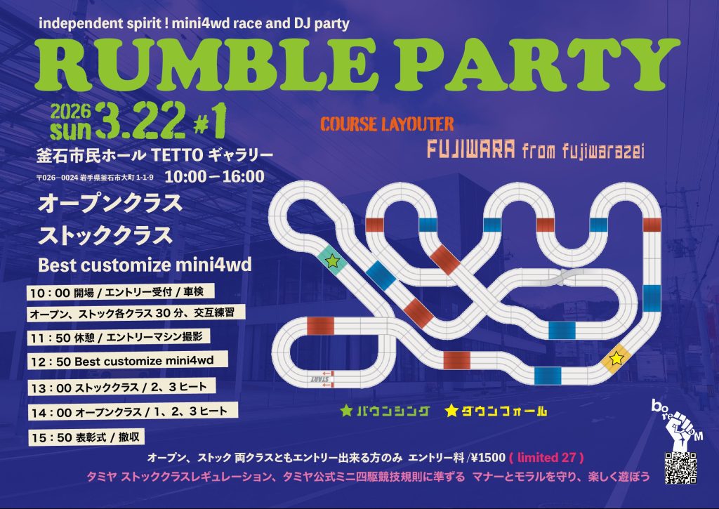 ミニ四駆レース ランブルパーティ#1 ワークショップ イベント概要 競技種目はオープンクラス、ストッククラス。Xでのエントリー予約受付となります。見学は自由です。 テットギャラリーに場所を移してから本格的なミニ四駆レース+DJイベント/ランブルパーティも今回で9回目。東北各地から沢山のレーサーさんが集まる三陸の名物イベント。今年は5回開催を予定してますがその第1回目となります。 開催日 2026年3月22日(日) 開催時間 10:00 〜 16:00 会場 釜石市民ホールTETTO ギャラリー share