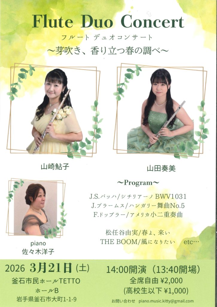 Flute Duo Concert コンサート イベント概要 開催日 2026年3月21日(土) 開場時間 13:40 開演時間 14:00 会場 釜石市民ホールTETTO ホールB 料金 全席自由 2,000円 高校生以下1,000円 お問い合わせ 山崎 佐々木 share
