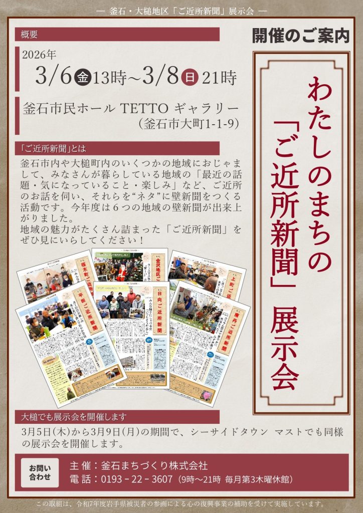 わたしのまちの「ご近所新聞」展示会 その他 イベント概要 開催日 2026年3月6日(金)〜 3月8日(日) 開催時間 9:00(6日13:00) 〜 21:00 会場 釜石市民ホールTETTO ギャラリー 料金 無料 お問い合わせ 釜石まちづくり株式会社 0193-22-3607 share