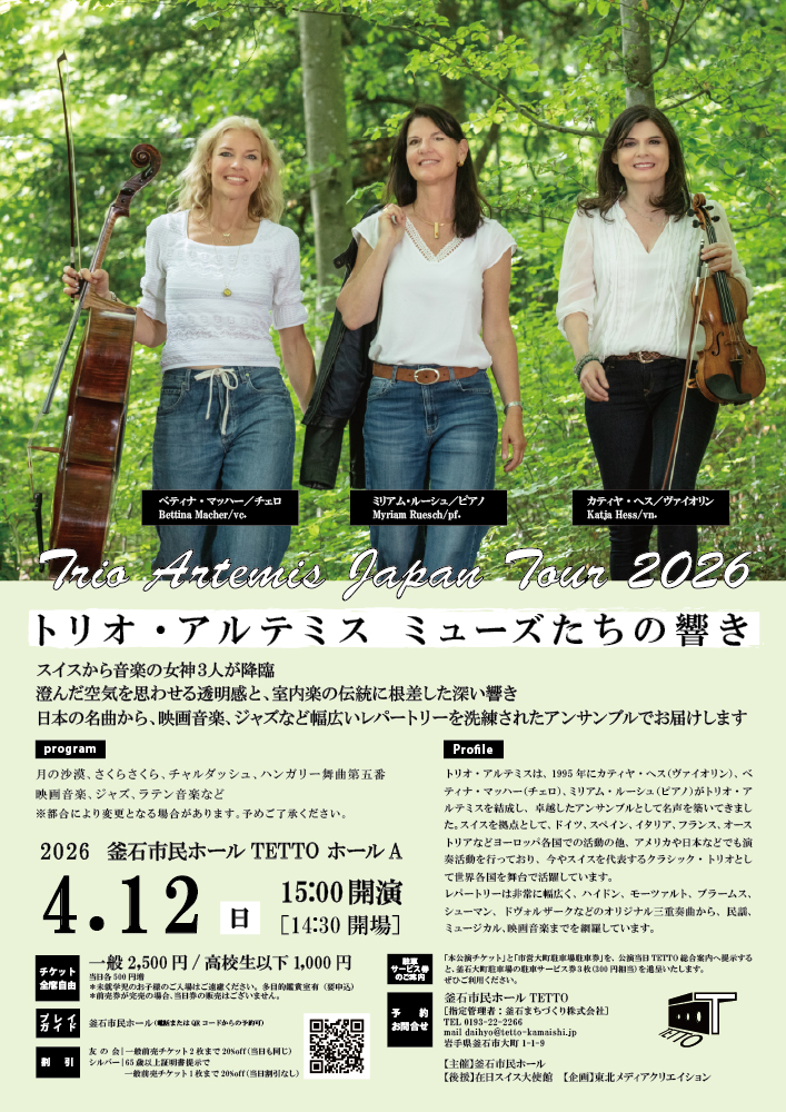 トリオ・アルテミスは、1995 年にカティヤ・ヘス(ヴァイオリン)、ベティナ・マッハー(チェロ)、ミリアム・ルーシュ(ピアノ)がトリオ・アルテミスを結成し、卓越したアンサンブルとして名声を築いてきました。スイスを拠点として、ドイツ、スペイン、イタリア、フランス、オーストリアなどヨーロッパ各国での活動の他、アメリカや日本などでも演奏活動を行っており、今やスイスを代表するクラシック・トリオとして世界各国を舞台で活躍しています。