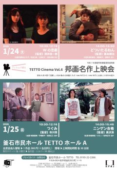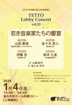 ピックアップイベントPICKUP EVENT イベント一覧 コンサートホール主催 TETTOロビーコンサートvol.10 若き音楽家たちの響宴 開催日時 2026年1月4日(日) 開演 14:00 開催場所 共通ロビー チケット販売中映画 フィルムで観る TETTO Cinema Vol.6 邦画名作上映会 開催日時 2026年1月24日(土)〜 1月25日(日) 開催場所 ホールA ホール主催ワークショップ舞台・演劇 演劇のお仕事体験プログラム 開催日時 2025年12月20日(土)〜 12月21日(日) 開催場所 ホールA釜石情報交流センター 釜石PIT ホール主催 あなただけの音楽会 アンサンブルコンテスト応援企画 開催日時 2025年12月13日(土)〜 12月14日(日) 開催時間 10:00 〜 20:00 開催場所 ホールA イベント一覧 イベントカレンダーEVENT CALENDER 2025年 12月月火水木金土日1234567令和7年度 福祉作文受賞作・幼児福祉絵画コンクール展示会ふゆぬくしいちギターでお茶間します891011121314保守点検日ともに気づき、ともに歩むための勉強会~ひきこもり支援の在り方を考える~フーテンノヨガあなただけの音楽会 アンサンブルコンテスト応援企画第11回かまいしこども園クリスマスキャロル第148回ファミリーコンサート ~ノイホフ・イン・パープルクリスマス~15161718192021演劇のお仕事体験プログラム令和7年度岩手県アンサンブルコンテスト釜石気仙支部大会中村ダンススタジオ Xmasダンスパーティー22232425262728保守点検日青空バンビルーム『おやこでわくわくクリスマス!』年末年始休業2930311234年末年始休業TETTOロビーコンサートvol.10 若き音楽家たちの響宴ミニ四駆ワークショップ・ 交流会 RUMBLE MATEZ ランブルメイツ お知らせNEWS お知らせ一覧 年末年始休業について 2025/12/06 営業時間臨時変更のお知らせ(9月13日18:00閉館) 2025/08/28 施設利用料金の当日キャンセル料金徴収について(2025年6月25日一部改訂) 2025/06/25 「きっとてっと」出店者募集のお知らせ 2025/04/06 TETTO友の会 2025年度会員募集のお知らせ 2025/03/28 お知らせ一覧 FACEBOOKSNS 施設案内INFORMATION 施設一覧 ホールA ホールB ギャラリー スタジオA・B・C 会議室2 和室1・2 施設一覧